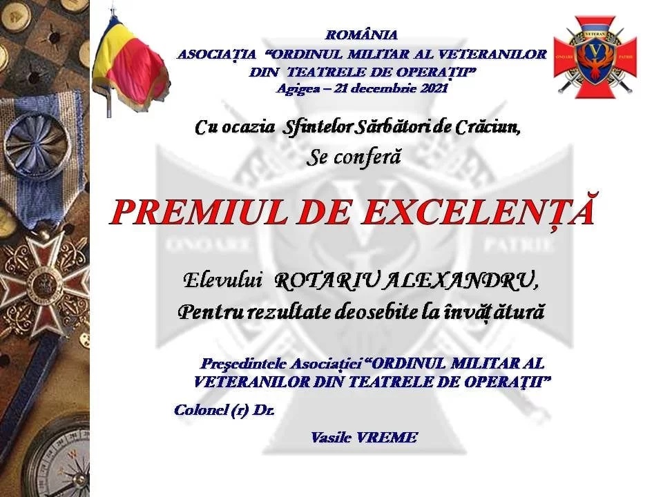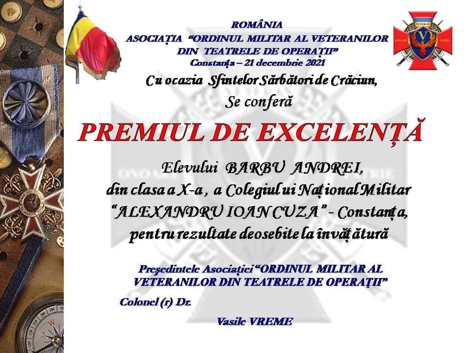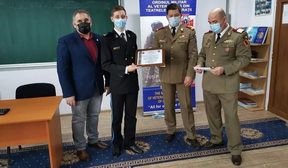 Cu mare bucurie, reprezentanții Ordinului Militar al Veteranilor au fost primiți la Colegiul Național Militar ,,Alexandru Ioan Cuza,, din Constanța, unde au oferit în prezența colegilor, a dirigintei – prof. Valeria Hînză și a directorului-adjunct prof. dr. Adrian Ilie, un premiu în bani elevului cu cea mai mare medie din clasa a X-a B, elevul-fruntaș Barbu Andrei David.